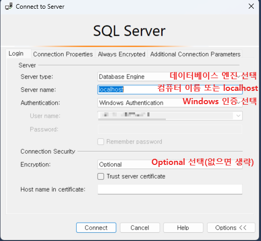 - 서버 이름 (Server name) : 컴퓨터 이름 또는 localhost를 입력한다.