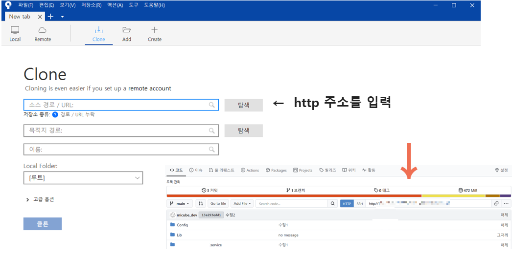 2. Github, gitea 등에서 http 주소를 복사한 후, 소스 경로 창에 입력한다.